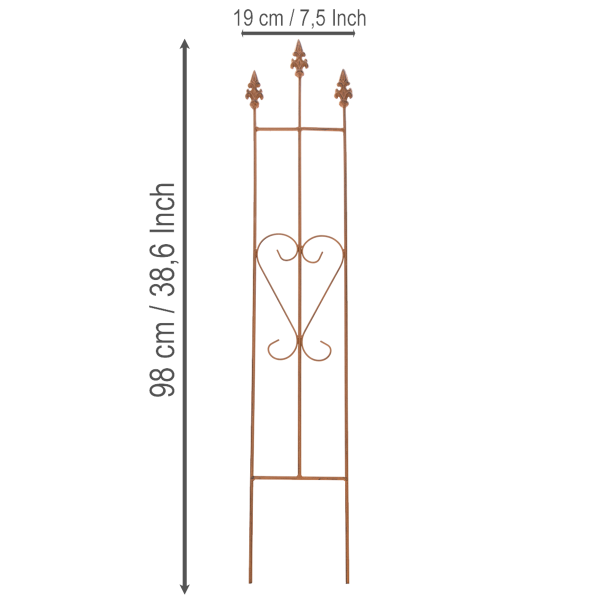 Por que se contentar apenas com funcionalidade quando ela também pode ser bela? Nossa treliça de jardim tem um design decorativo em formato de coração, combinando funcionalidade com estética. Com seu formato de coração delicadamente curvado, ela traz romantismo e descontração para qualquer jardim. Além de servir de suporte para plantas trepadeiras como rosas e hera, ela transforma até mesmo canteiros ou vasos simples em um deleite visual. O acabamento em aço envelhecido confere um charme rústico e natural que se harmoniza perfeitamente com jardins de estilo campestre ou clássico. Seja como suporte para rosas românticas ou como elemento decorativo na varanda, esta treliça oferece inúmeras possibilidades.
