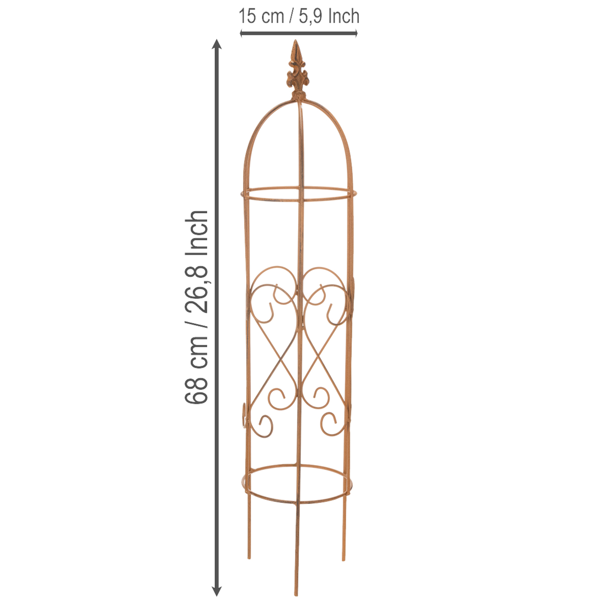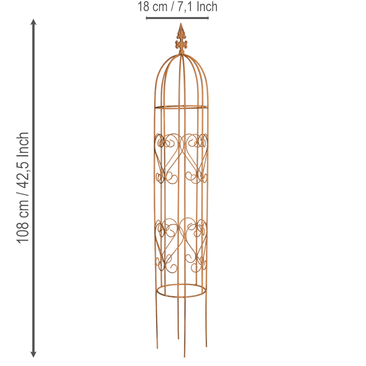 Ideal para uso em áreas externas protegidas, mas também adequada para uso interno, por exemplo, para exibir plantas artificiais de forma decorativa. Com suas dimensões compactas – 18 centímetros de diâmetro e 108 centímetros de altura – a treliça de metal é flexível e fácil de posicionar.