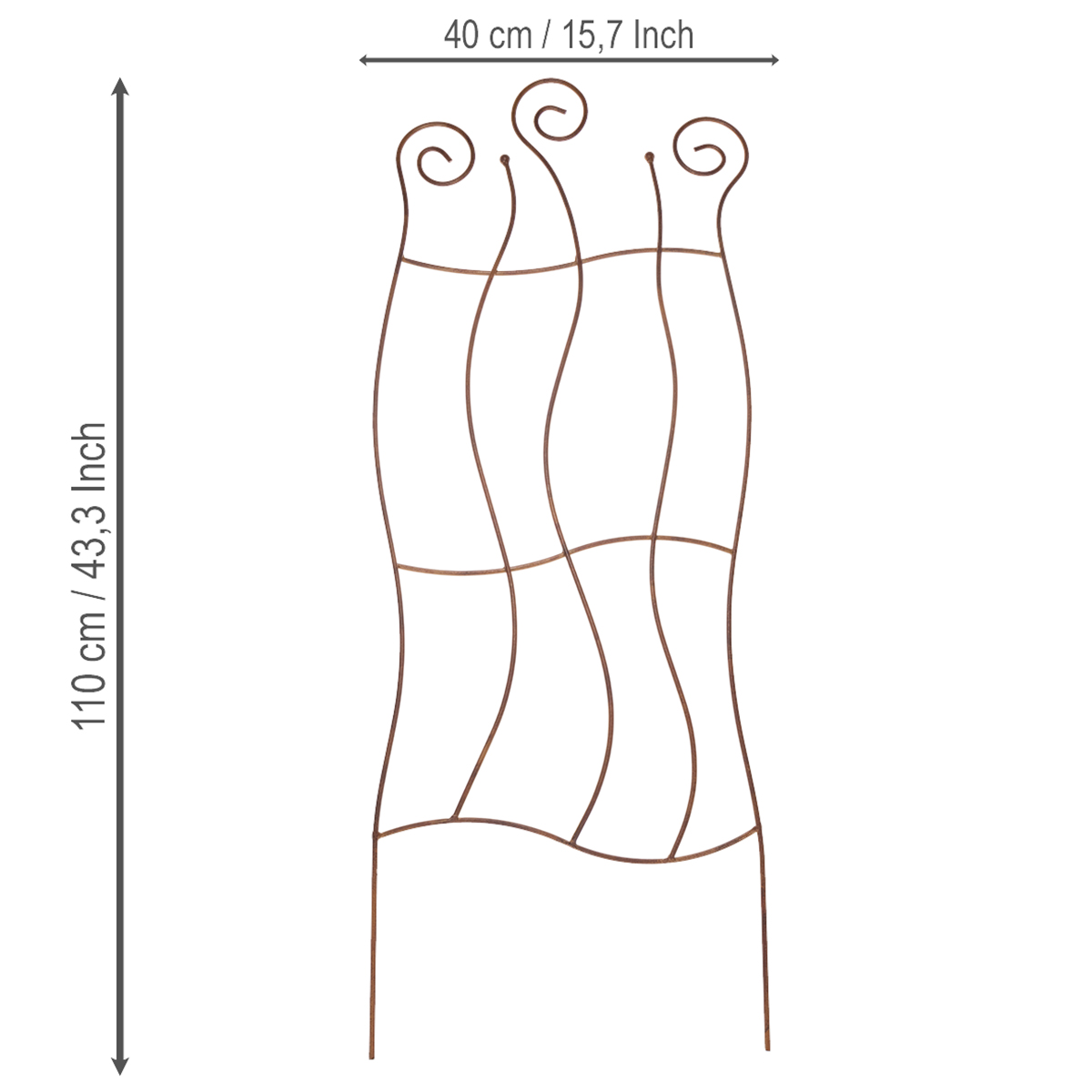 Esta treliça metálica decorativa é um complemento maravilhoso para qualquer jardim. Suas linhas fluidas conferem-lhe um ar de elegância que se integra perfeitamente a projetos de jardins naturais, românticos ou modernos. Graças à sua construção robusta, a treliça não só proporciona um suporte estável, como também serve de elemento decorativo – seja como divisória entre áreas do jardim ou como um destaque atraente ao longo de caminhos e canteiros de flores. A pátina de aço envelhecido cria um visual sofisticado que harmoniza lindamente com qualquer ambiente. E o melhor de tudo: a treliça é incrivelmente fácil de limpar. Basta um pano úmido para remover a sujeira e os resíduos da ação do tempo.
