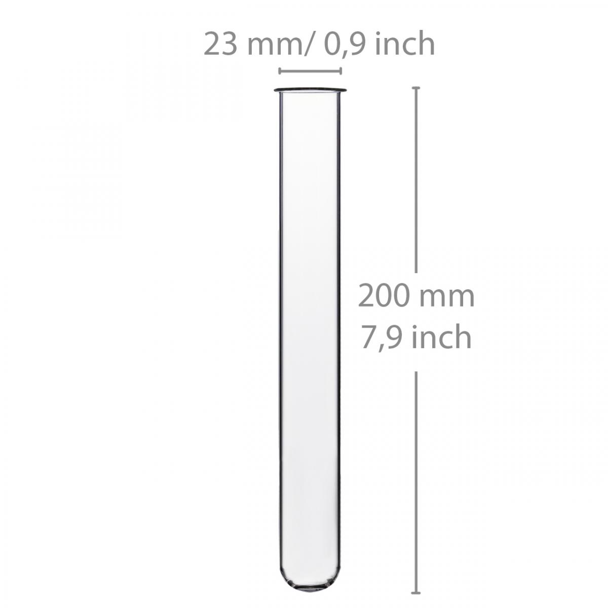 O tubo de ensaio é fornecido com um comprimento de aproximadamente 200 milímetros e um diâmetro interno de aproximadamente 22 milímetros; a borda curva para fora garante um diâmetro externo de cerca de 28,5 milímetros.