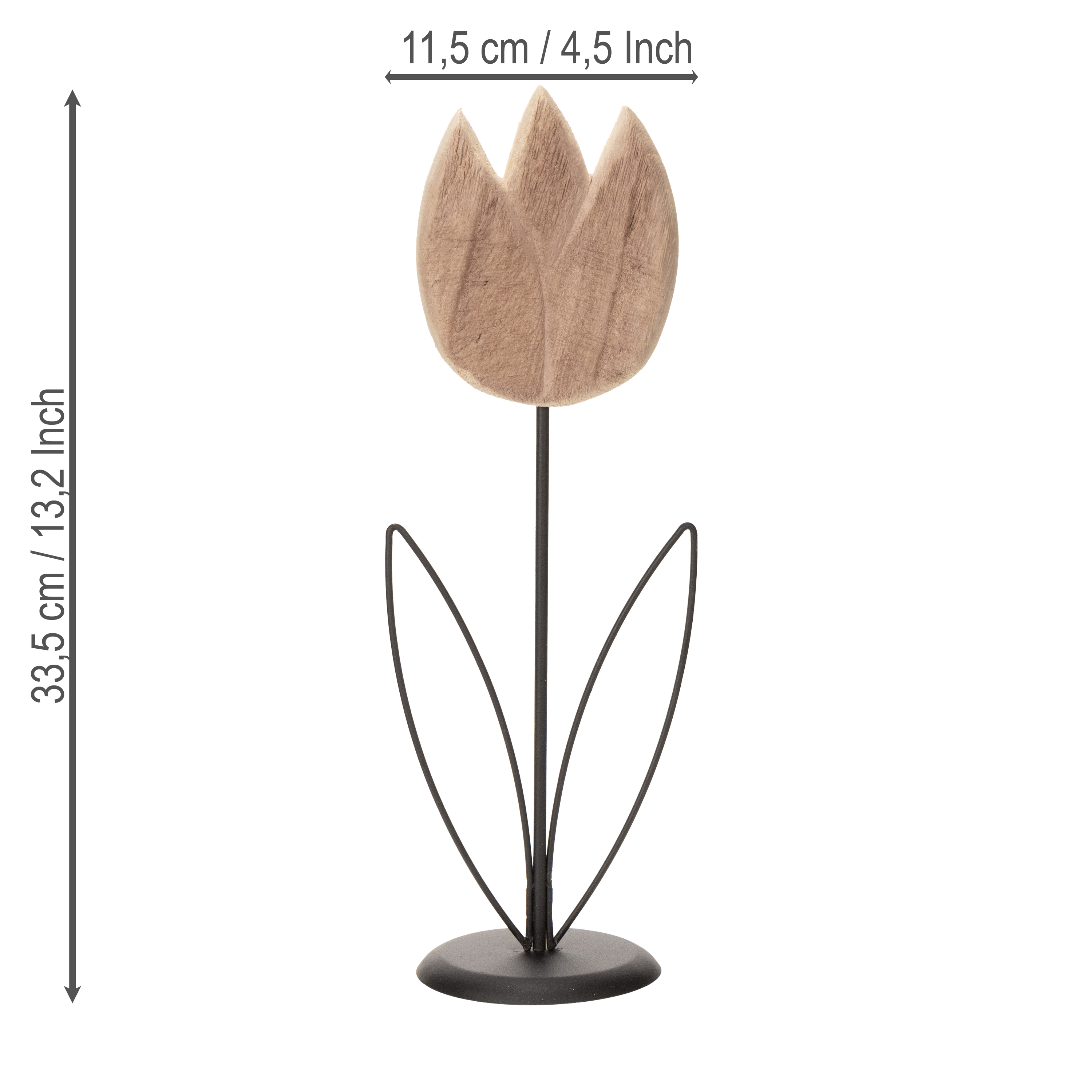 Este objeto decorativo em forma de tulipa se destaca por seu design simples, porém expressivo. A cabeça em formato de tulipa é feita de madeira de alta qualidade, cuja textura natural confere um aspecto particularmente autêntico. As folhas, o caule e a base são feitos de metal resistente, garantindo estabilidade. Seja qual for o seu estilo de decoração preferido — moderno, escandinavo ou clássico —, esta tulipa decorativa se integra perfeitamente a qualquer ambiente. Fica especialmente bonita quando combinada com outros itens decorativos de metal ou madeira — por exemplo, em um pequeno arranjo com velas ou vasos.