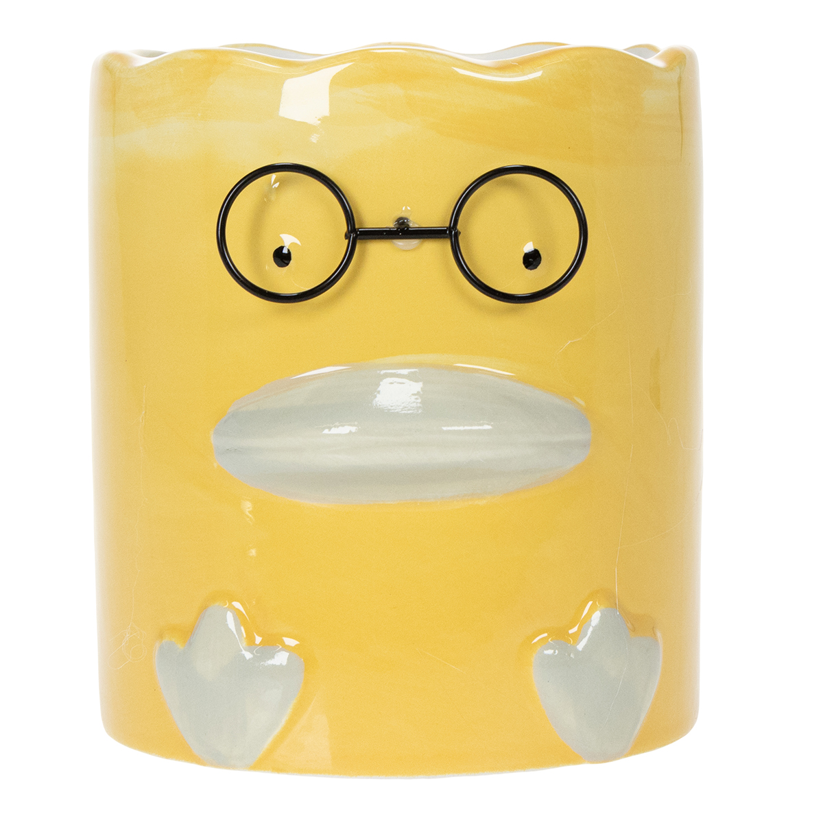 Este vaso de cerâmica amarela com motivo animal combina funcionalidade e estética de uma forma verdadeiramente especial. Com 13 cm de altura e 12 cm de diâmetro, oferece amplo espaço para flores, flores secas ou até mesmo canetas e materiais de escritório. A cerâmica de alta qualidade garante estabilidade e durabilidade, enquanto o charmoso design de pato, com seus detalhes delicados como a abertura ondulada e os óculos divertidos, adiciona um toque moderno e bem-humorado. Este vaso é ideal para exibir flores secas de cores claras ou flores frescas. Para um visual mais natural, também pode ser usado para plantar pequenas plantas de interior, como suculentas. É perfeito também para guardar canetas ou outros pequenos objetos, tornando-se um complemento prático para um escritório ou quarto infantil. Esta peça decorativa não é apenas um belo complemento para a sua casa, mas também uma ótima ideia de presente para amigos ou para uma inauguração de casa. Uma combinação perfeita de utilidade prática e beleza decorativa!