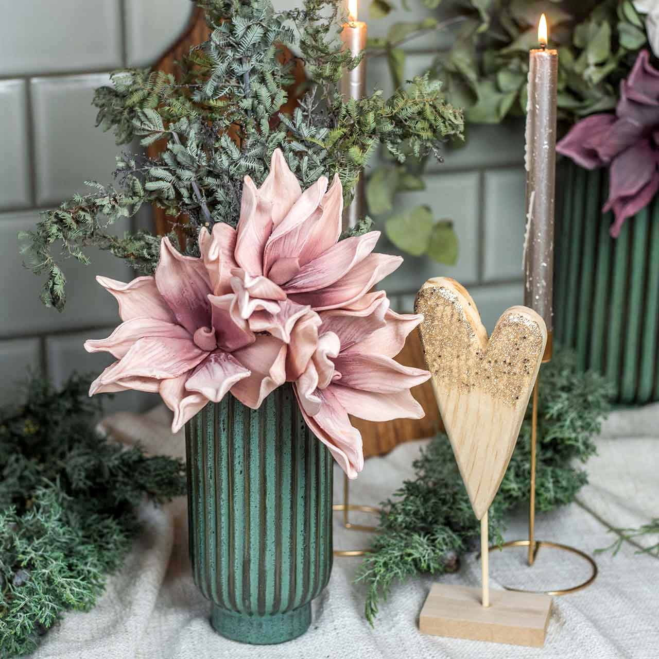 Este vaso de cerâmica é um elemento perfeito para uma decoração floral elegante para decoração de mesa. - O vaso decorativo canelado em verde-castanho é versátil para ideias de decoração florística em qualquer estação!Coloque flores secas ou frescas no extraordinariamente belo vaso de cerâmica e você terá o arranjo de flores certo para cada ocasião. Na primavera, os ramos de salgueiro saca-rolhas são decorados com ovos de Páscoa, nos girassóis de verão, no outono ramos de vidoeiro com pendentes de outono e na época do Natal verde pinheiro com bolas de Natal ou ramos de cerejeira como ramos de Bárbara.