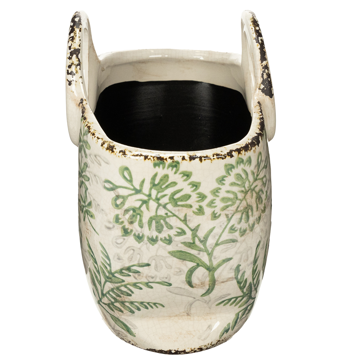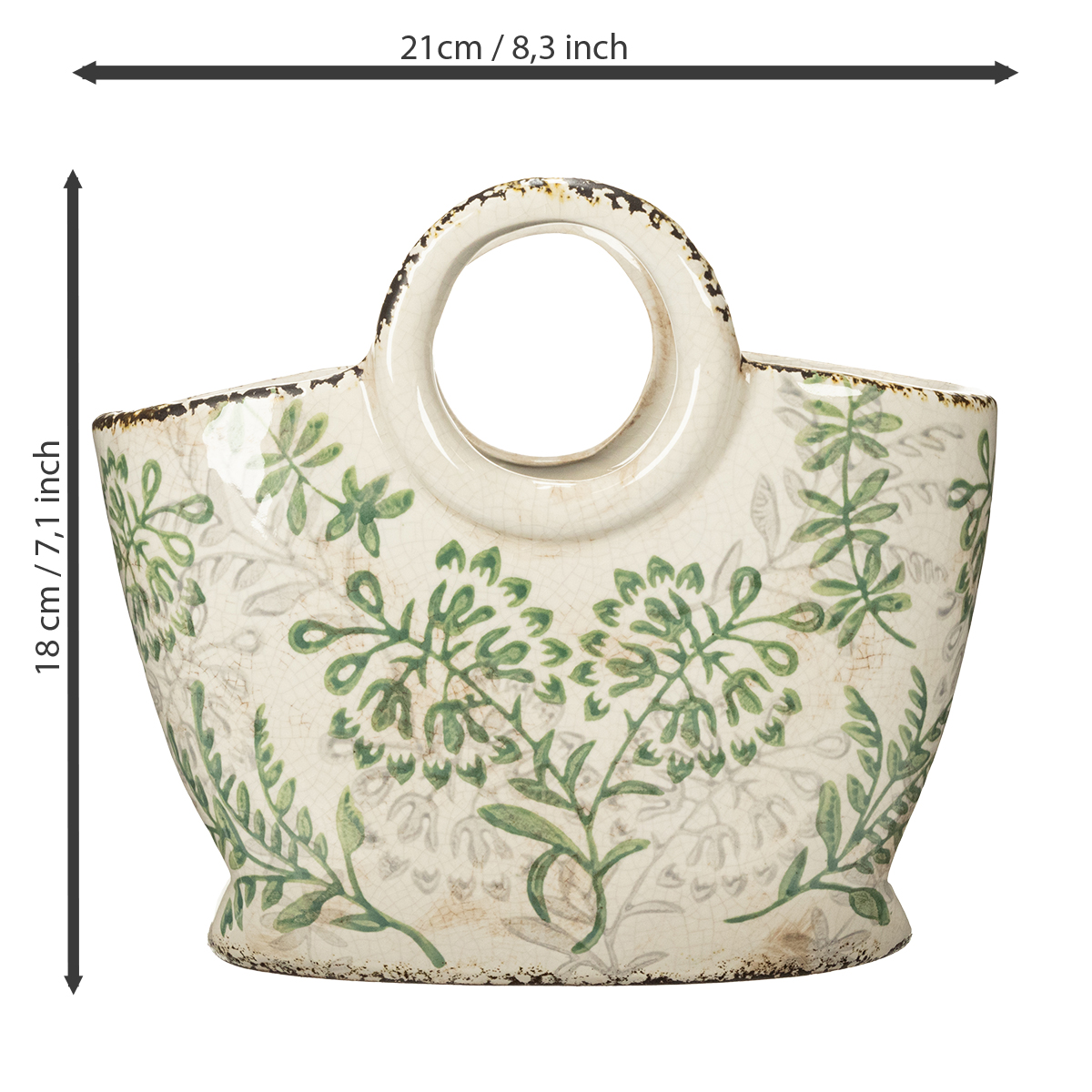 O material cerâmico robusto é durável e adequado tanto para uso interno quanto externo. Esta peça vintage brilha intensamente em varandas ou peitoris de janelas. A decoração com folhas verdes confere ao objeto um aspecto natural que destaca lindamente suas plantas. Não é à toa que vasos estilosos como este estão se tornando cada vez mais populares como elementos decorativos criativos.