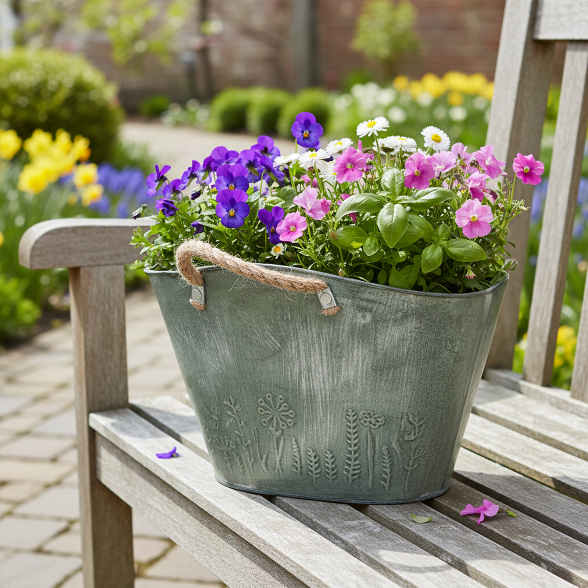As alças feitas de grossas cordas de juta aperfeiçoam a bolsa decorativa de metal e tornam a floreira um destaque. Mas o motivo em relevo com flores, grama e borboletas em verde e cinza também oferece muito para se olhar.