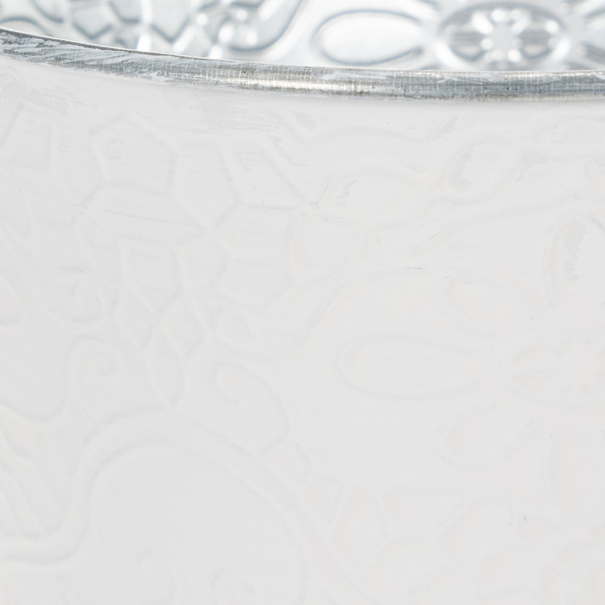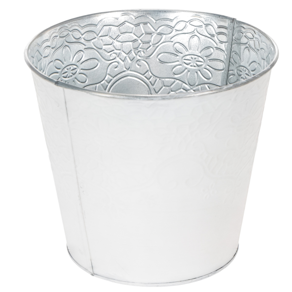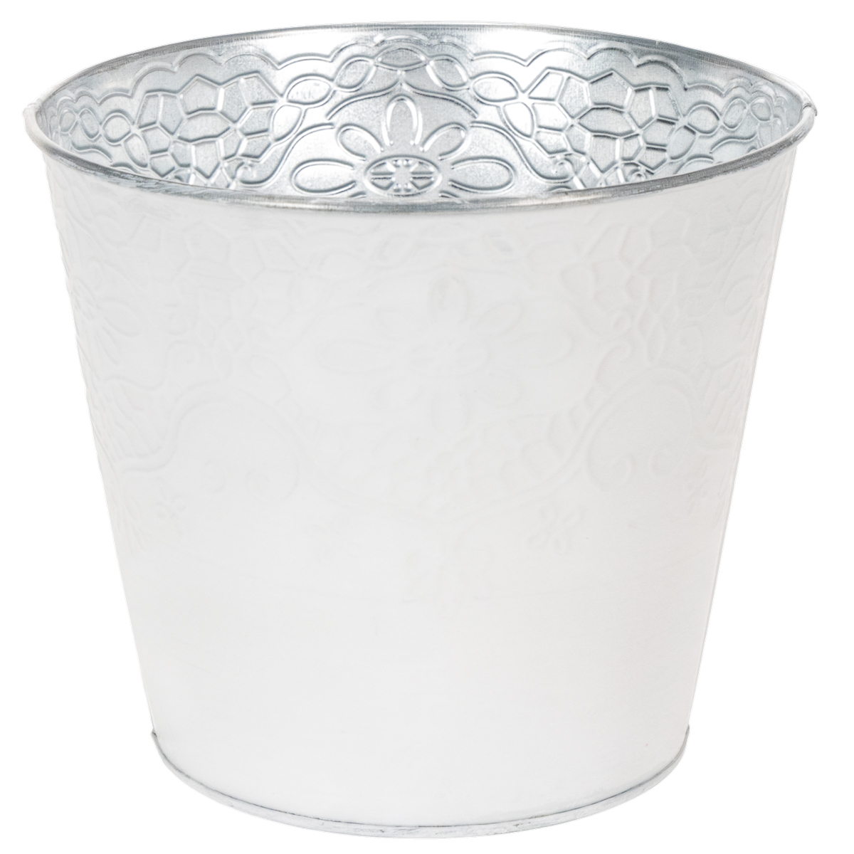 Um padrão detalhado de gavinhas e flores adorna o vaso de metal como um relevo. Em combinação com a pintura branca pastel do lado de fora, isso cria um cachepot maravilhosamente nostálgico para a primavera!