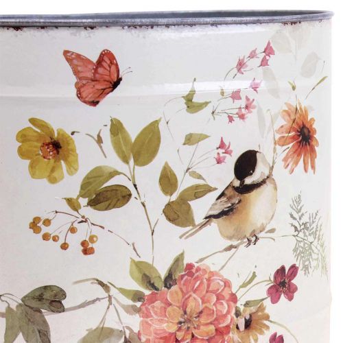 O balde é galvanizado e coberto com uma atraente estampa de flores e pássaros em filme plástico de alta qualidade. Os pássaros coloridos estão sobre um fundo de cor creme. O cabo com cabo de madeira completa o clima vintage!