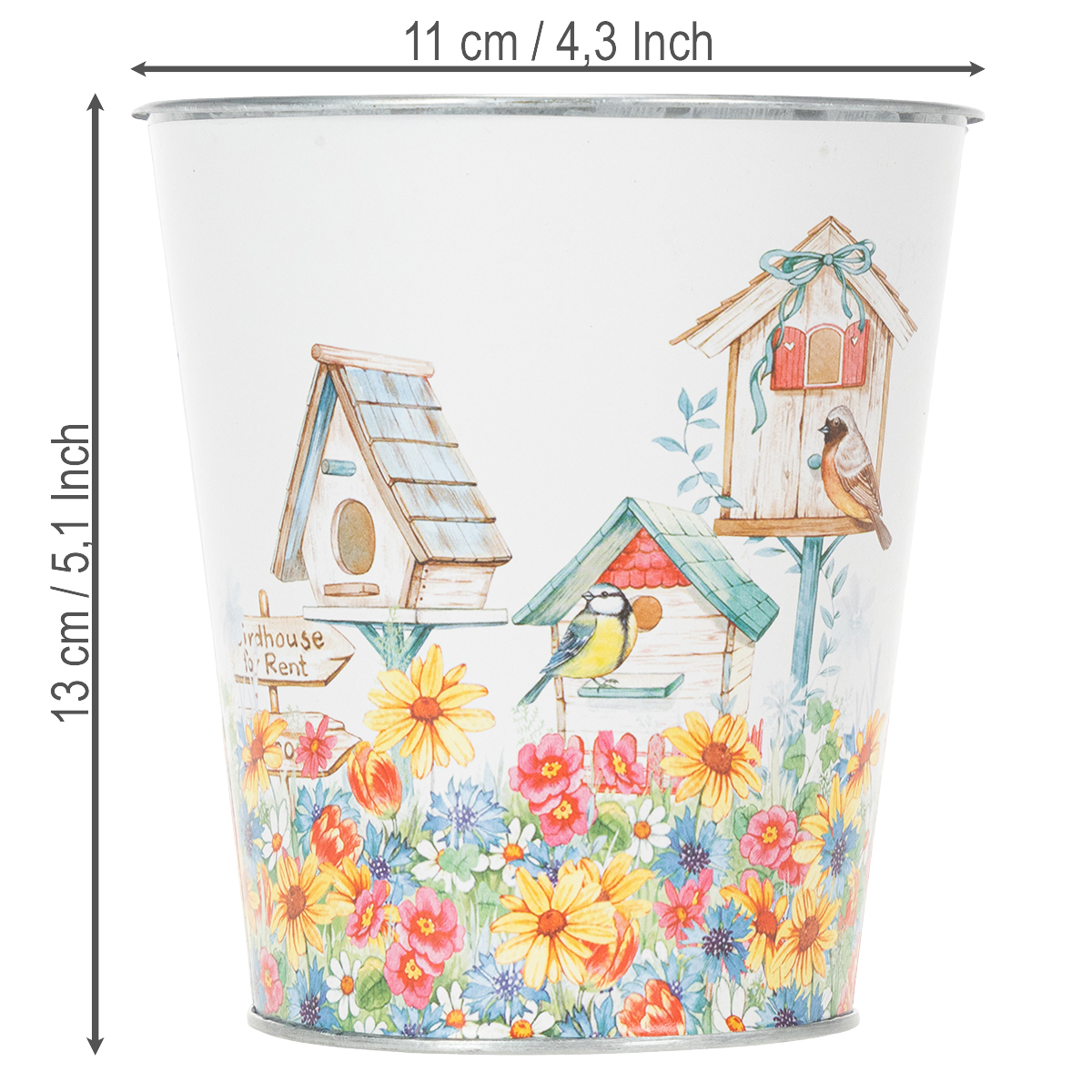 Vaso de metal com motivo decorativo, floreira com casinhas de pássaros, balde de lata A13cm Ø11,5cm