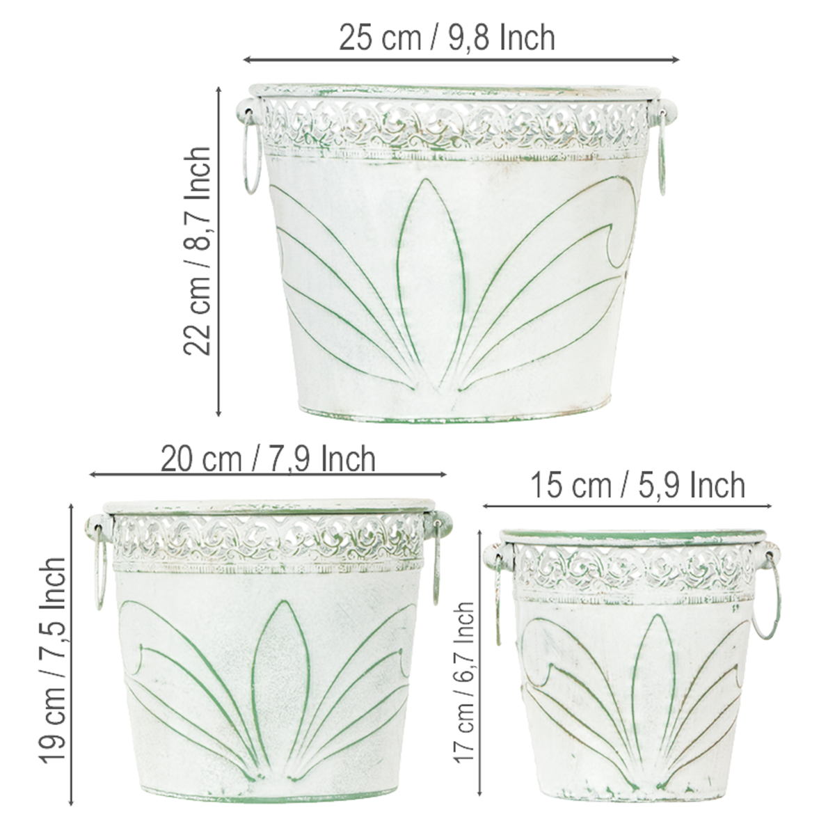 Vaso de metal com relevo e alças, branco e verde, estilo shabby chic, A22/19,5/17,5cm, Ø25,5/20,5/15,5cm, conjunto de 3