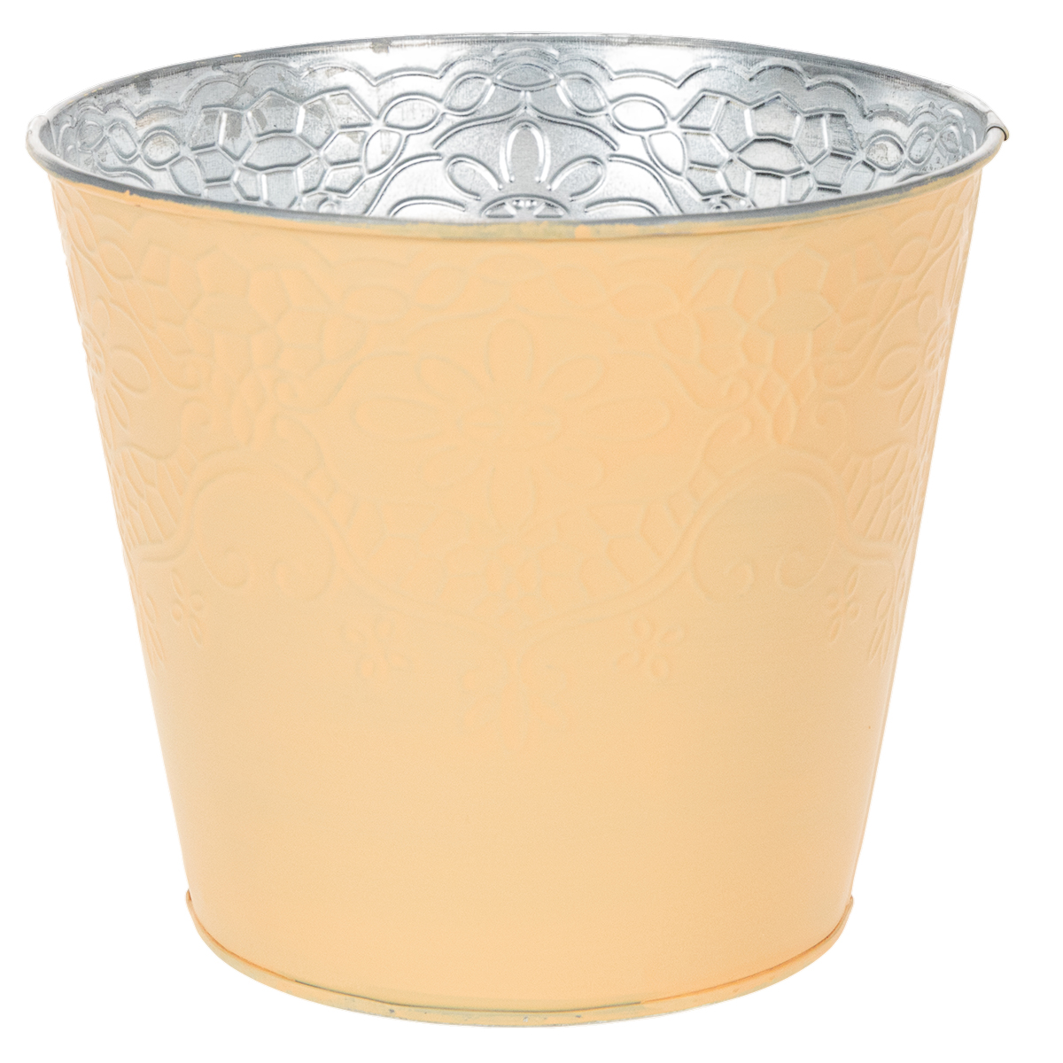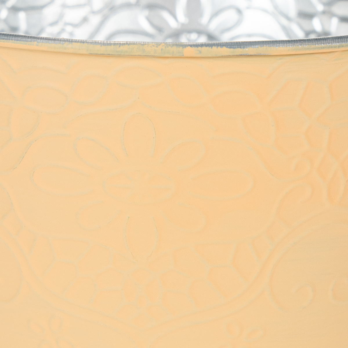 O padrão é gravado em detalhes com motivos de gavinhas e flores e se destaca no vaso de flores. O exterior pintado de laranja contrasta com o interior prateado metálico não tratado com a base galvanizada.