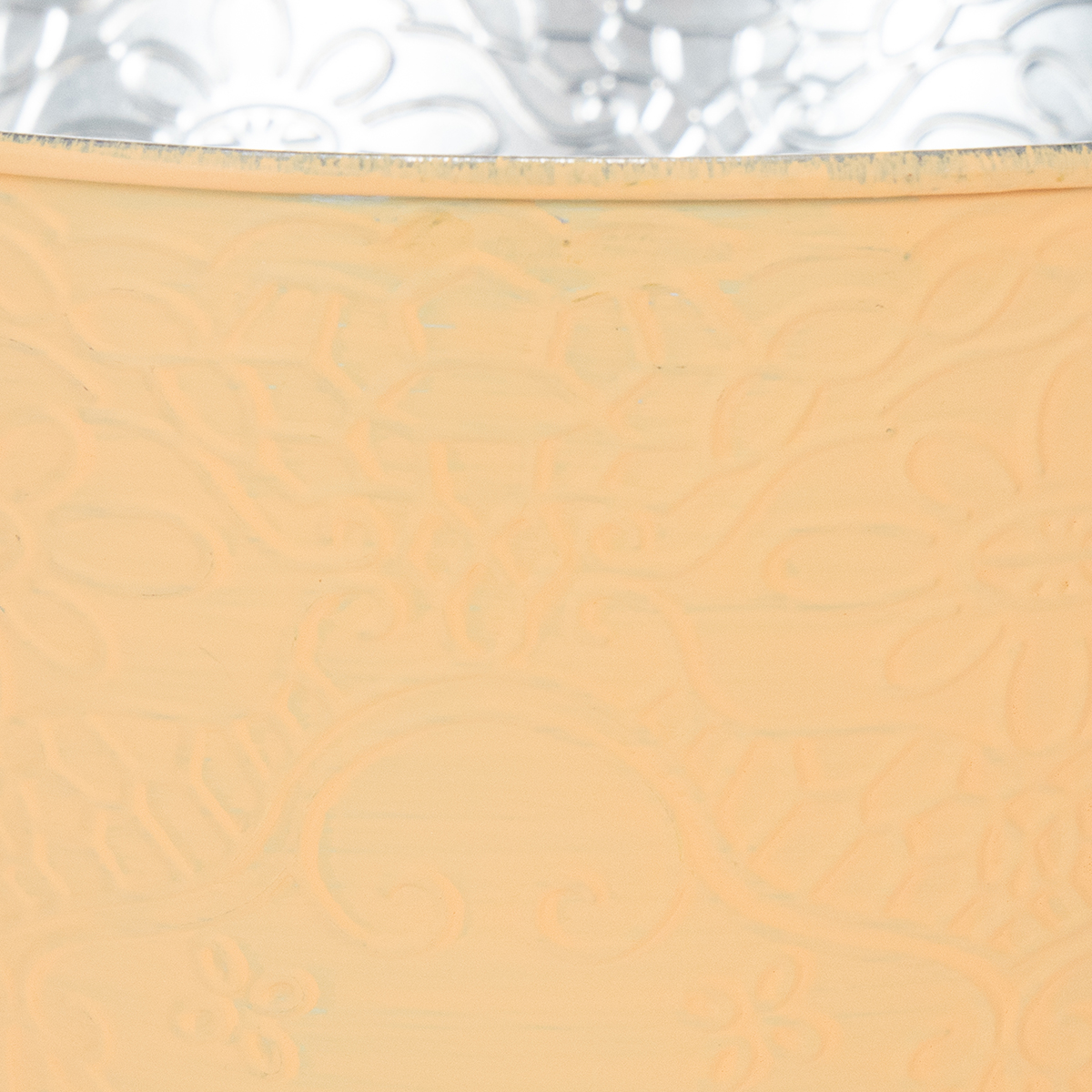 As flores e gavinhas em relevo dão ao vaso de flores uma ótima aparência vintage. A parte externa agrada com o moderno tom pastel laranja aplicado com pinceladas visíveis.