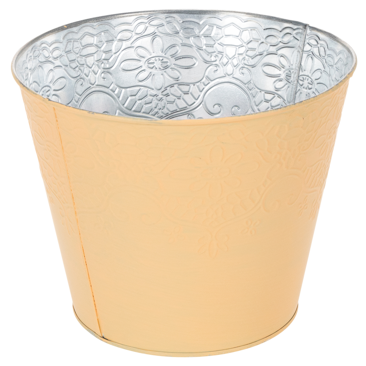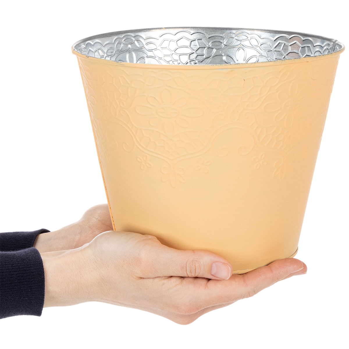 A panela é sem pintura por dentro, ou seja, naturalmente prateada, e tem fundo galvanizado. Para o plantio, também é aconselhável forrar o vaso com papel alumínio.