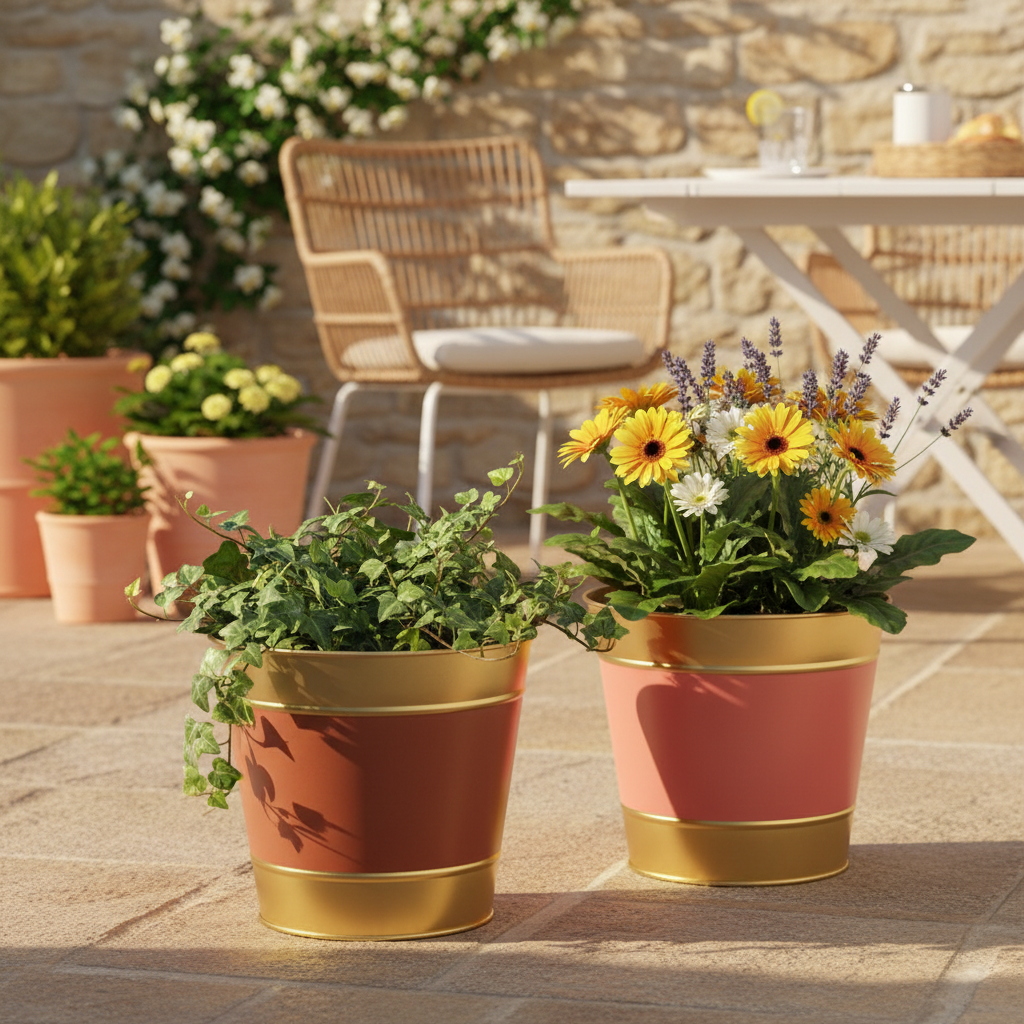 Este conjunto de quatro vasos de plantas com borda dourada e o grande esquema de cores irá inspirá-lo. Os vasos de flores de metal vêm nas cores modernas de marrom, bege, rosa e pêssego.