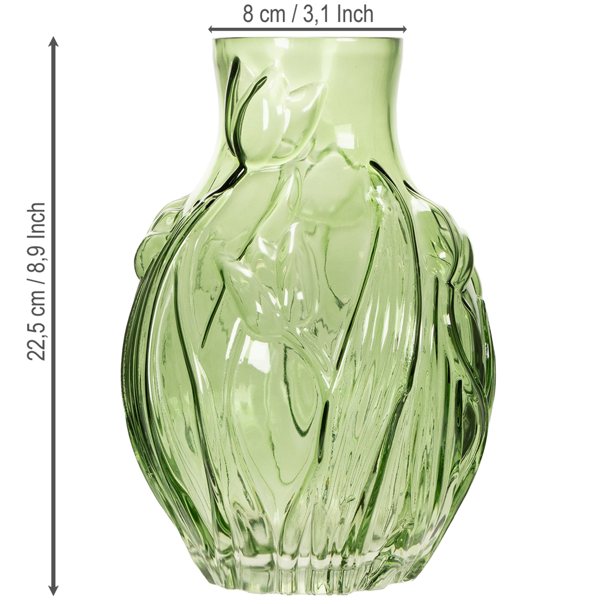 Este vaso é mais do que um simples recipiente para flores – é uma peça de design que adiciona charme a qualquer ambiente. Feito de vidro de alta qualidade em um tom verde suave, ele é robusto e esteticamente agradável. O relevo em forma de tulipa proporciona uma experiência tátil única e um visual harmonioso que se integra perfeitamente a diversos estilos de decoração. Seja no estilo escandinavo, moderno ou até mesmo no romântico estilo campestre, este vaso certamente impressionará.