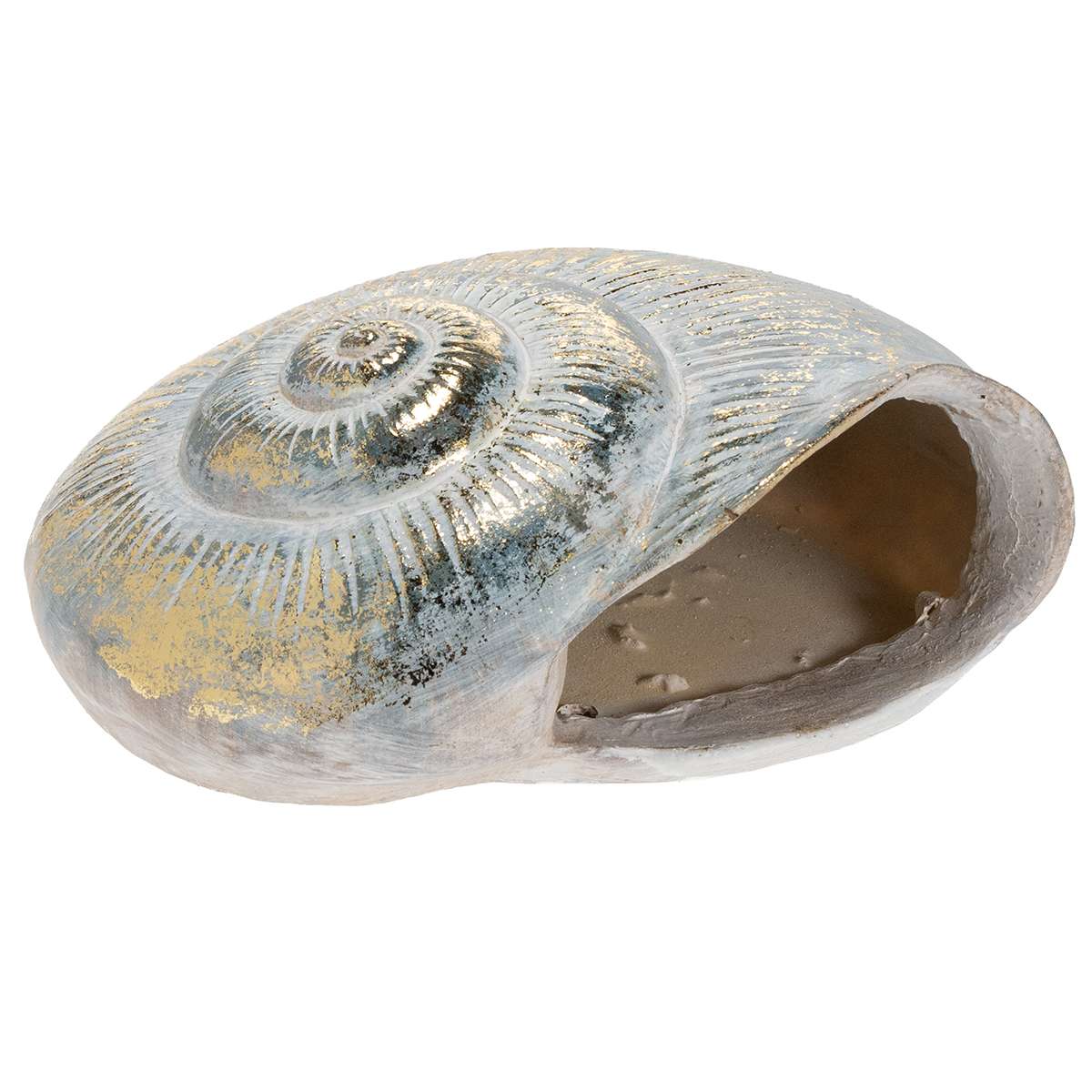 Procura um destaque especial para a decoração da sua parede ou mesa? Este vaso decorativo em forma de caracol vai certamente atrair todos os olhares. Com o seu aspeto único, cor cinzenta e subtil brilho dourado, traz um verdadeiro toque de casa de praia para a sua casa. Seja na sala de estar com motivos náuticos, no terraço para um ambiente de verão, ou até mesmo na casa de banho para uma decoração harmoniosa com temática marítima – este acessório de decoração encaixa sempre! É também prático e cuidadosamente concebido. A parte de trás é plana e possui um orifício para pendurar, permitindo-lhe posicionar o caracol de forma flexível ou fixá-lo na parede. Então, porque esperar mais? Traga um toque de charme marítimo para a sua casa com esta decoração de parede natural.