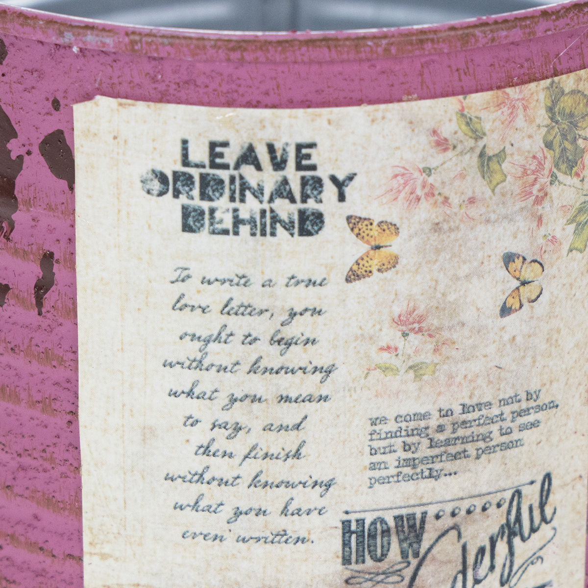 Esta floreira vintage apresenta-se habilmente como uma caixa decorativa em roxo. A decoração de verão de metal é lindamente bicolor: marrom enferrujado quente pode ser visto nas ranhuras da lata. O tom pastel roxo é harmoniosamente arredondado. Um rótulo com borboletas e uma inscrição em diferentes fontes retrô, bem como alguns pontos de ferrugem pintados no plantador, criam um clima nostálgico de plantio.