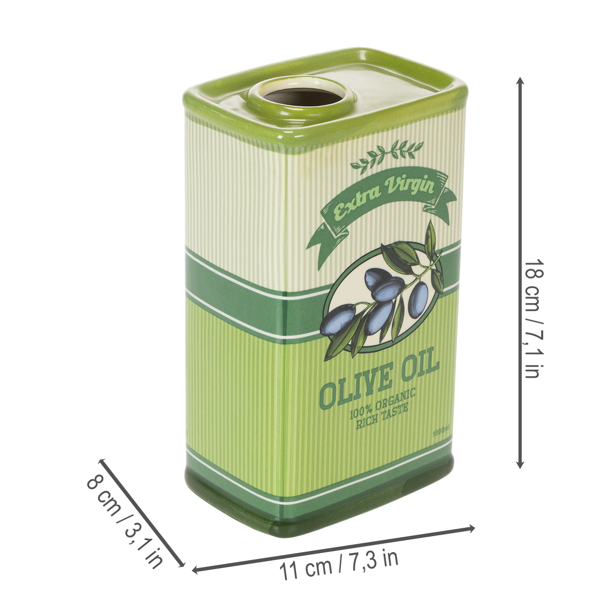 Nosso vaso de cerâmica para azeite impressiona com detalhes imediatamente perceptíveis: o design retrô nostálgico, inspirado nas cozinhas mediterrâneas, reflete tradição e estilo. O tom verde de alta qualidade traz um frescor natural a qualquer ambiente, seja uma mesa moderna ou uma cozinha rústica. A capacidade generosa e a boca larga facilitam o despejo do azeite. E quando não estiver sendo usado como recipiente, este charmoso vaso se transforma em um elemento decorativo marcante por si só.