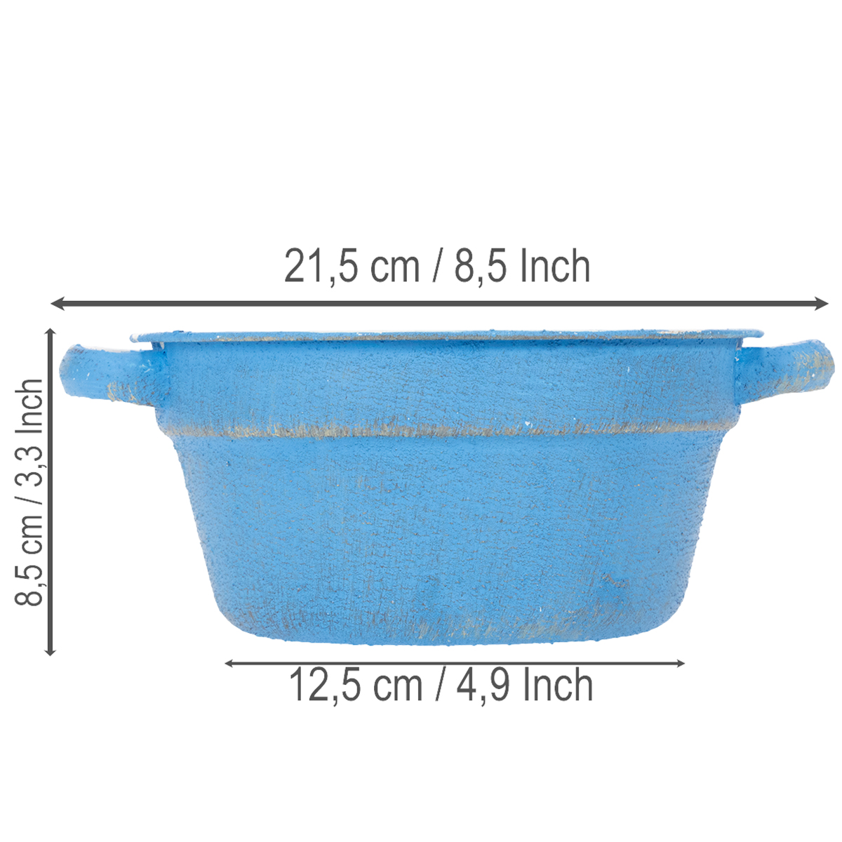 Esta tigela decorativa nostálgica com um toque de chique gasto permite que cada planta brilhe colorida! O cachepot em azul é uma decoração metálica particularmente bonita para o verão, mas também realça um ambiente marítimo intemporal.