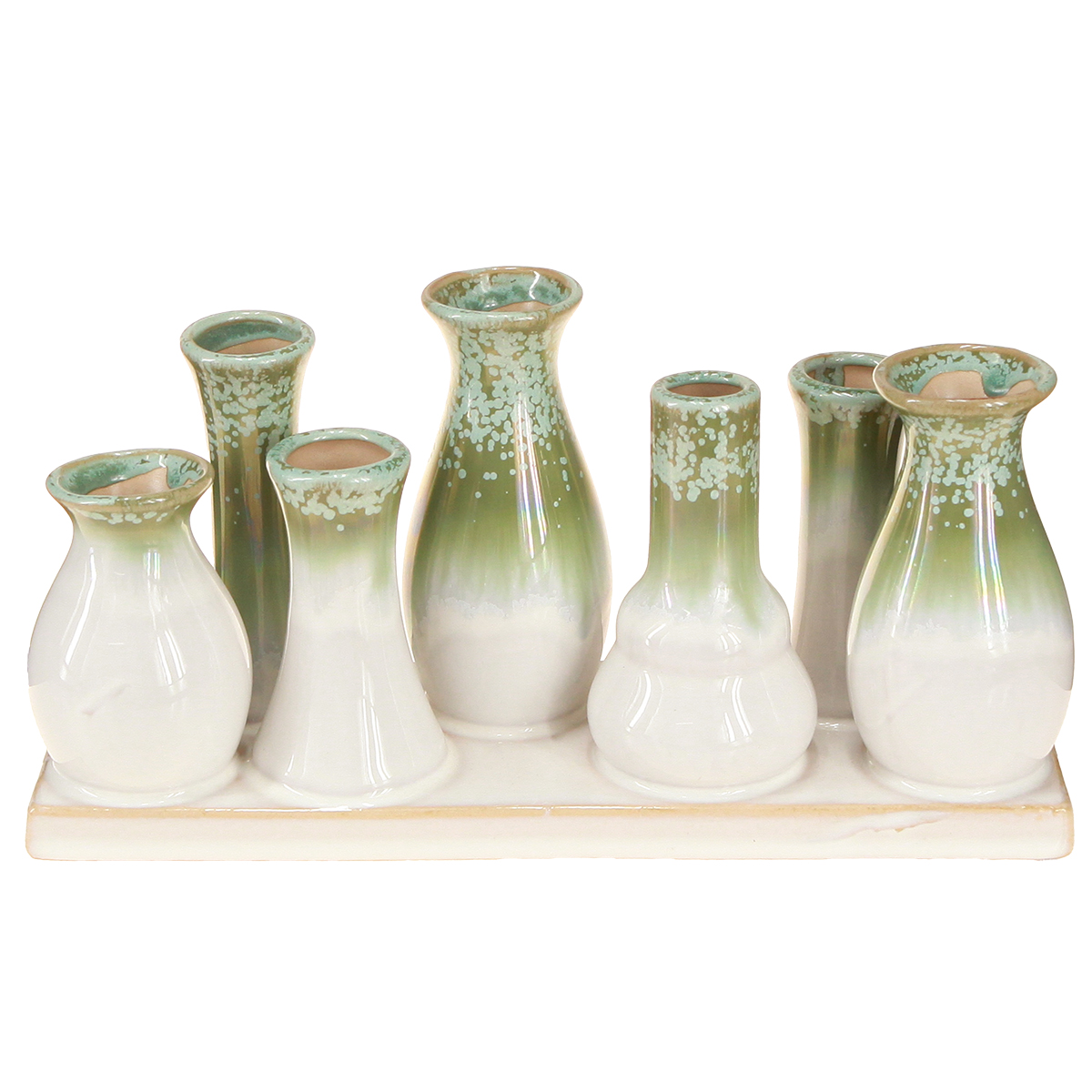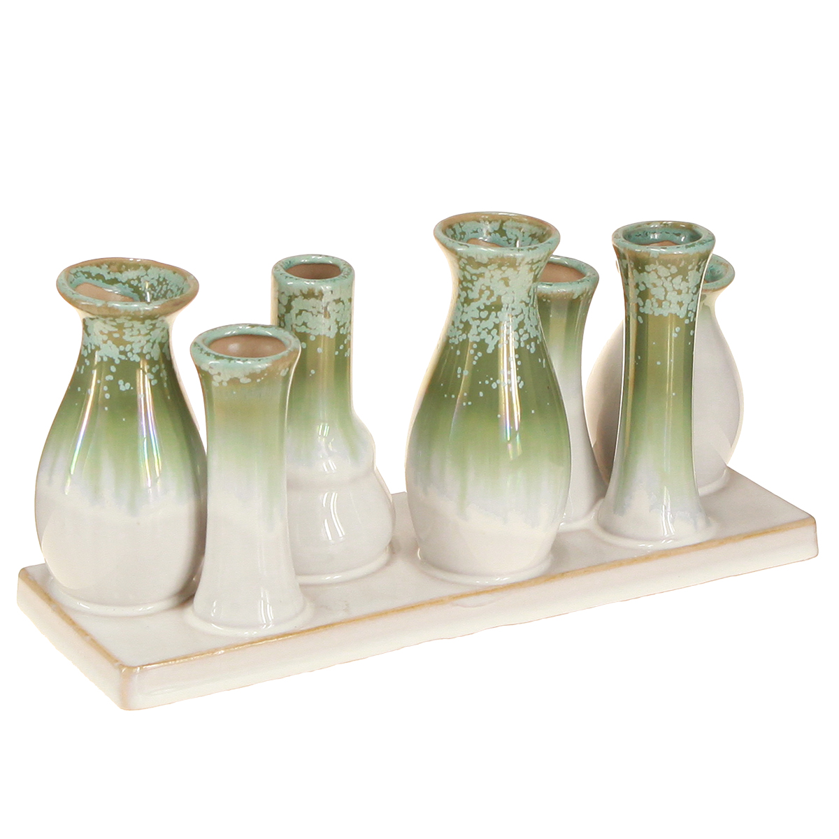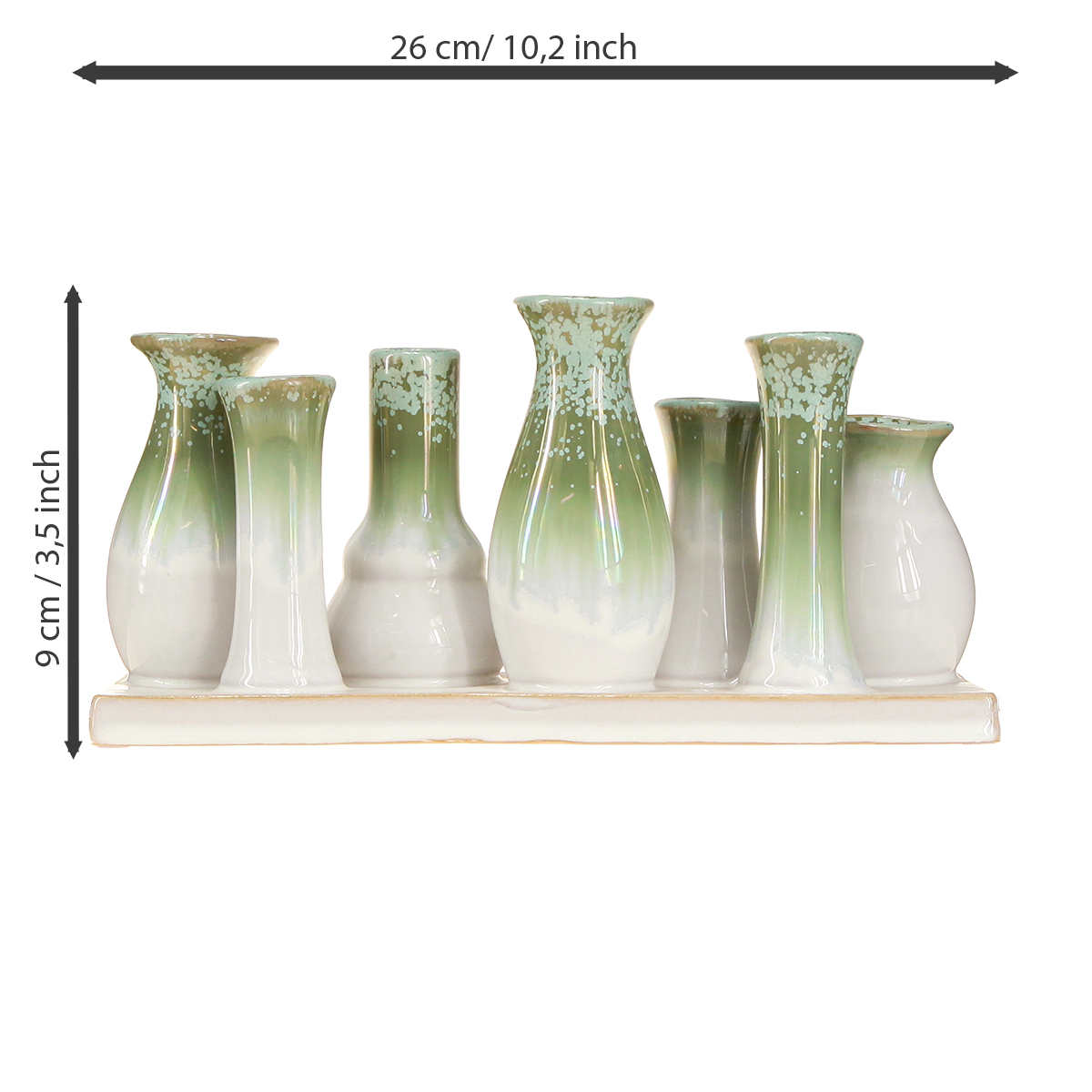 Este conjunto de sete pequenos vasos decorativos de cerâmica, dispostos numa bandeja com cores coordenadas, irá rapidamente tornar-se um destaque na sua decoração de interiores. Os tons harmoniosos de verde e branco evocam a naturalidade do design escandinavo e complementam na perfeição estilos minimalistas ou rústicos. Os vasos têm formatos diferentes, acrescentando interesse visual à cor creme. Quer sejam dispostos em conjunto ou individualmente, este conjunto oferece inúmeras possibilidades de decoração.