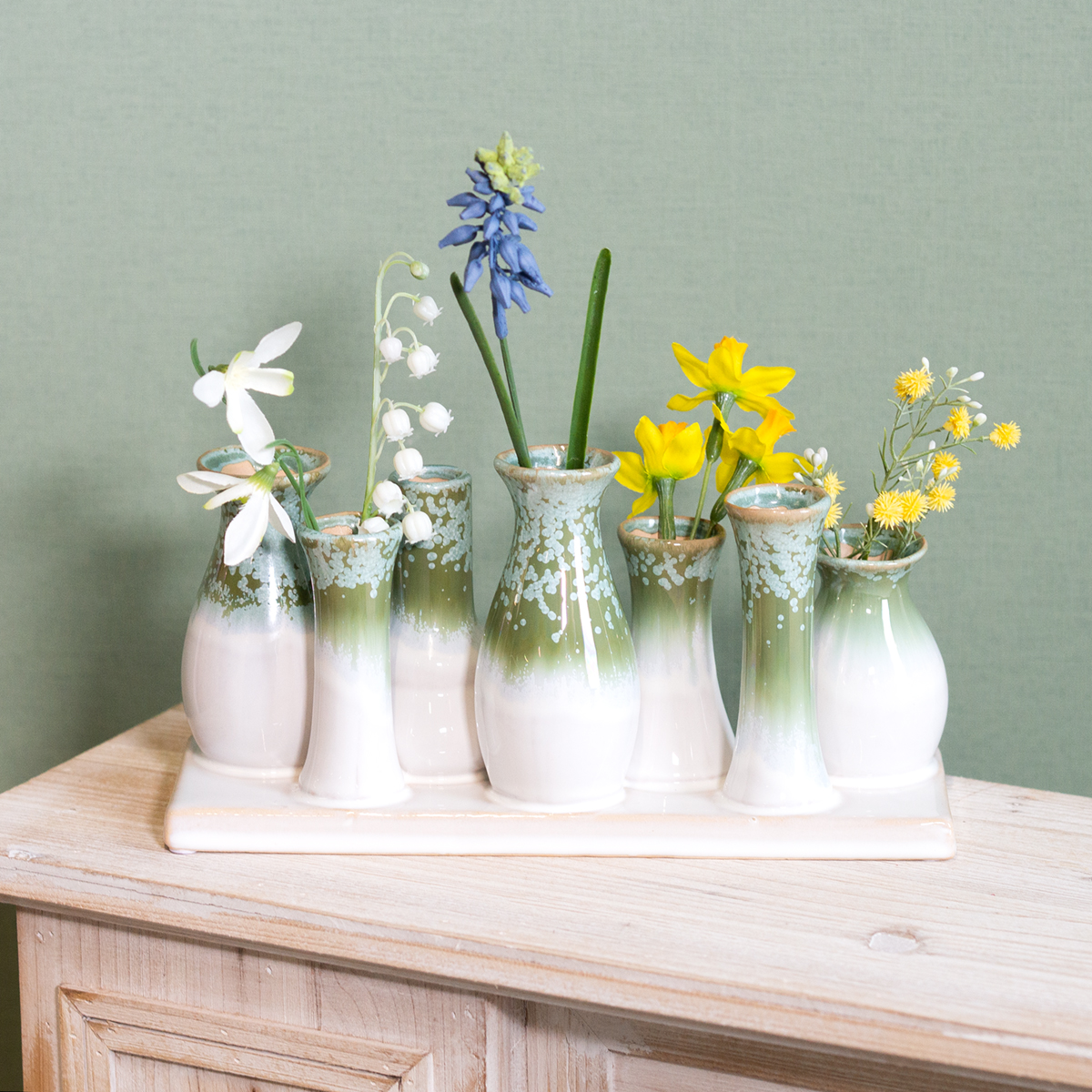 Este conjunto de sete pequenos vasos decorativos de cerâmica, dispostos numa bandeja com cores coordenadas, irá rapidamente tornar-se um destaque na sua decoração de interiores. Os tons harmoniosos de verde e branco evocam a naturalidade do design escandinavo e complementam na perfeição estilos minimalistas ou rústicos. Os vasos têm formatos diferentes, acrescentando interesse visual à cor creme. Quer sejam dispostos em conjunto ou individualmente, este conjunto oferece inúmeras possibilidades de decoração.