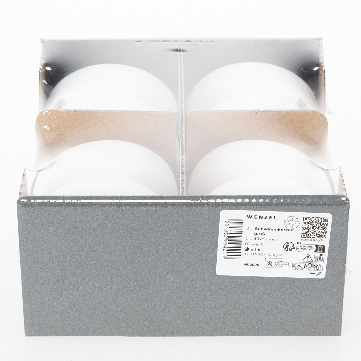 As velas flutuantes de cera branca são fornecidas em um conjunto de 8 unidades. Cada vela tem aproximadamente 8 centímetros de diâmetro e 4 centímetros de altura, com um tempo de queima de cerca de 8 horas.