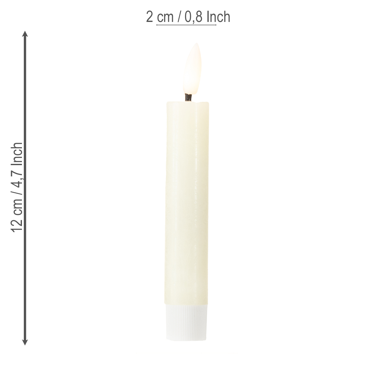 As velas têm 14,5 cm de altura e são ideais para castiçais elegantes de tamanho padrão, bem como para coroas de Advento. Elas fazem sua mágica não apenas em decorações festivas de Natal. Funcionam a pilhas e sem fio, podendo ser usadas em qualquer lugar – sem necessidade de tomada! Seja no parapeito da janela, na mesa ou como parte de um projeto romântico "faça você mesmo": essas velas cônicas são versáteis e conferem a qualquer ambiente um toque de estilo.