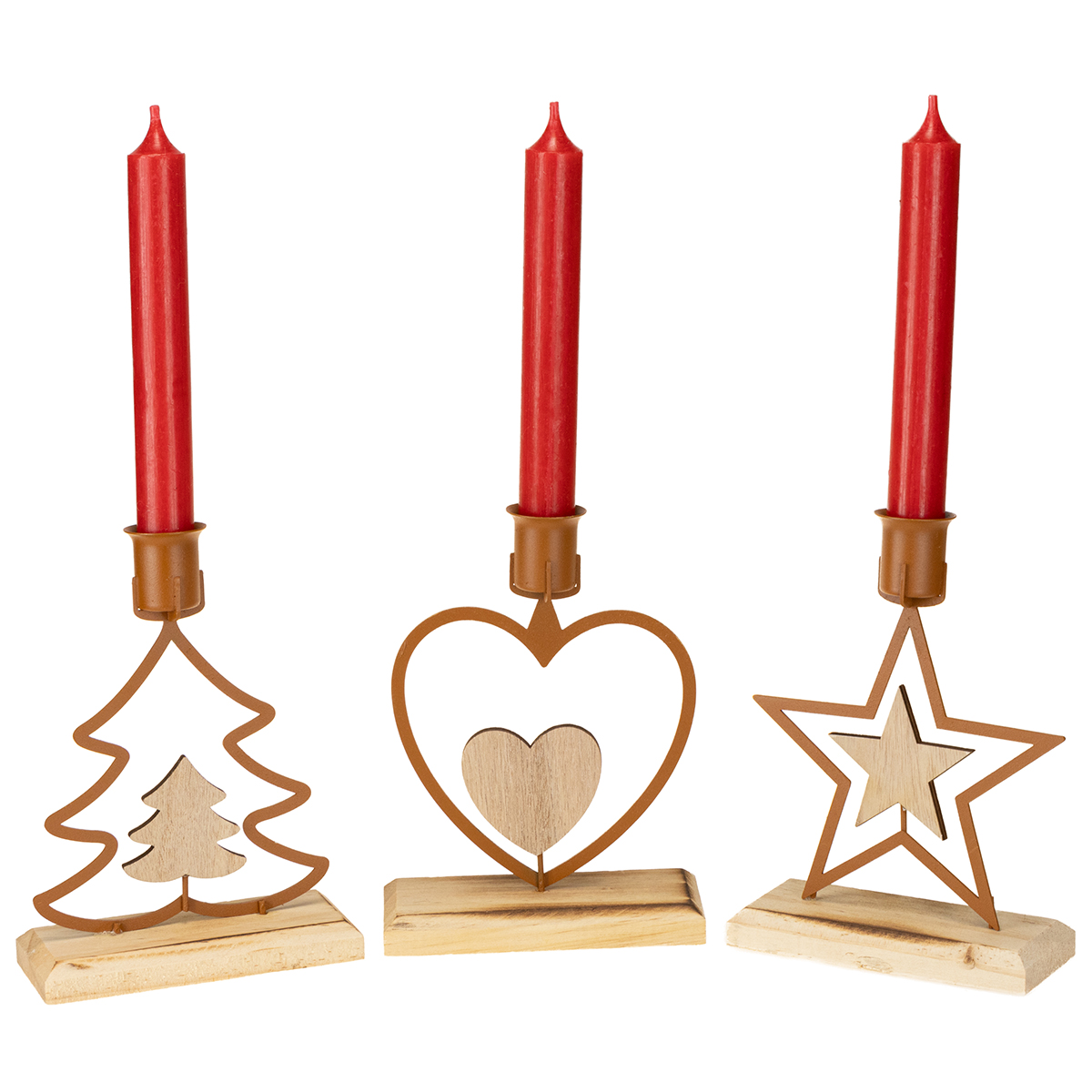 A silhueta de metal pintado de marrom ferrugem com o castiçal para velas longas fica em uma base sutilmente inflamada em madeira natural. No centro sob o castiçal, a estrela, o coração e a árvore de Natal podem ser vistos novamente como motivos de madeira.