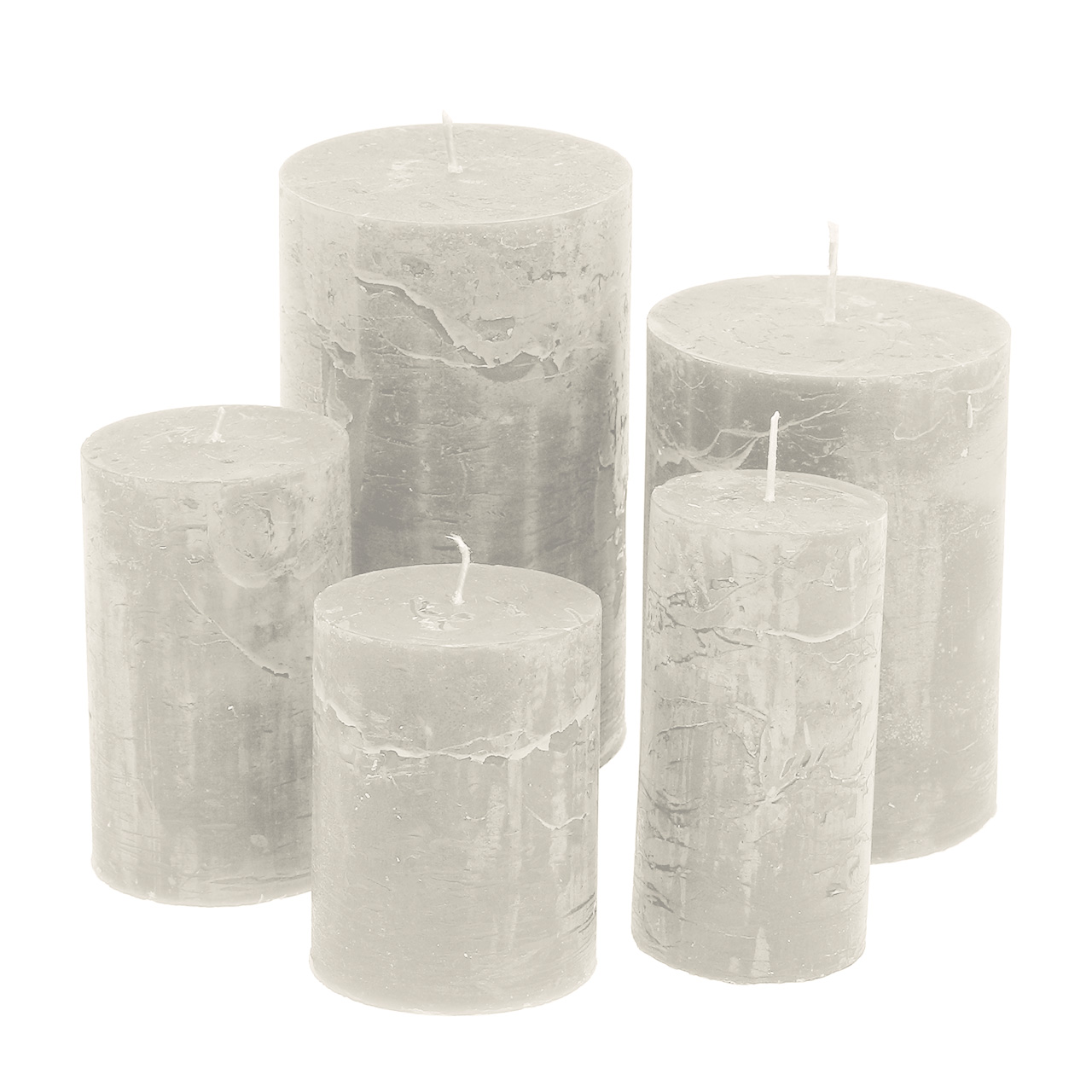 As velas pilares coloridas em cinza, que você pode selecionar em diferentes tamanhos através da guia do lado direito, são fornecidas em conjuntos de diferentes quantidades em embalagens de papelão. Ao queimar, observe os regulamentos de segurança para lidar com fogo aberto.