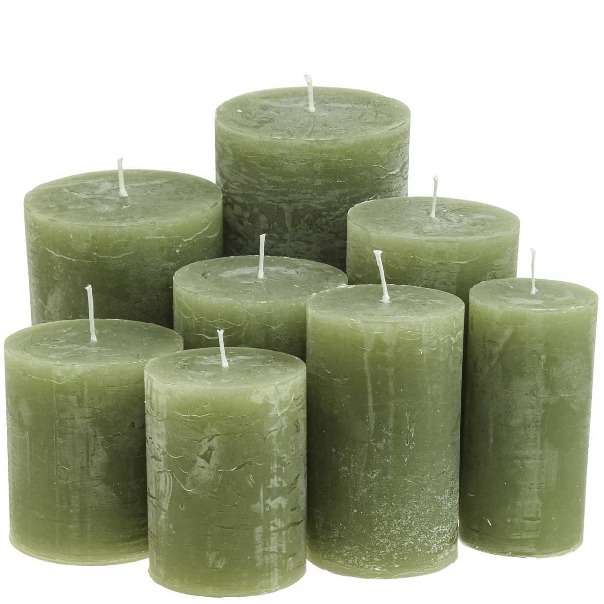 Em verde oliva, as velas coloridas são perfeitas para um prato de vela dourado ou uma tigela decorativa de aparência antiga, um anel decorativo ou uma lanterna. Decore com decorações modernas de grama dos pampas ou flores secas branqueadas no verão ou no outono.