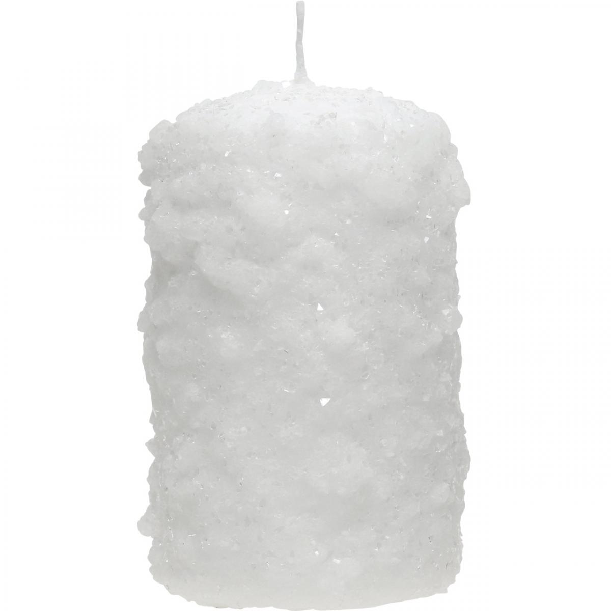 As velas de Natal têm a textura superficial de neve comprimida e também têm um brilho gelado de pequenas partículas transparentes que foram aplicadas irregularmente nas velas de pilar para o Advento.