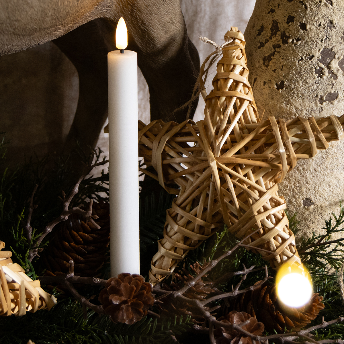 Você adora o brilho aconchegante das velas, mas não quer chamas de verdade? Então, nossas velas cônicas de LED brancas são a escolha perfeita! Com seu design atemporal, feitas de cera de verdade e uma agradável luz branca quente, essas velas de LED a pilhas criam um ambiente agradável em qualquer ambiente. Seja para jantares românticos, comemorações ou noites aconchegantes em casa, essas velas de LED com efeito de chama são versáteis e seguras. Sem marcas de queimado no caminho de mesa, sem manchas de cera e sem fuligem — relaxe e aproveite a luz segura das velas. Combine as velas de 24,5 cm de altura com candelabros decorativos ou uma coroa de Advento e você ficará surpreso com a elegância que elas complementam sua decoração.