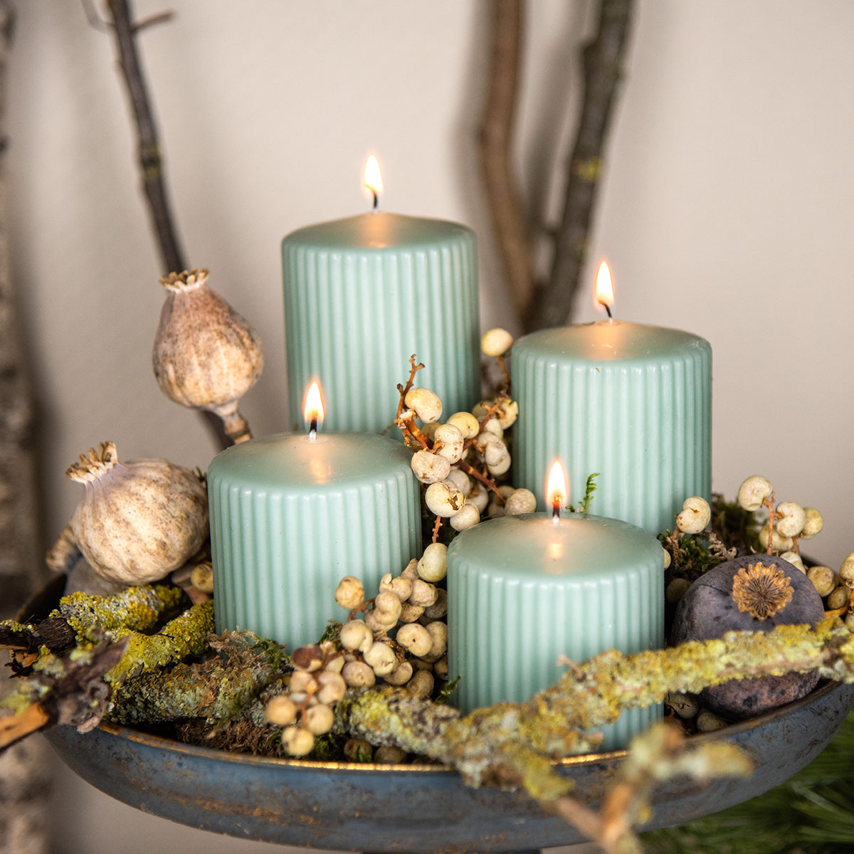 As velas pilares são entregues em uma caixa com quatro - ideais para a decoração do Advento e perfeitas como presente. E se procura ainda mais opções para a decoração das suas velas, também encontrará na nossa loja velas pilares com e sem ranhuras em diversos tamanhos e cores.